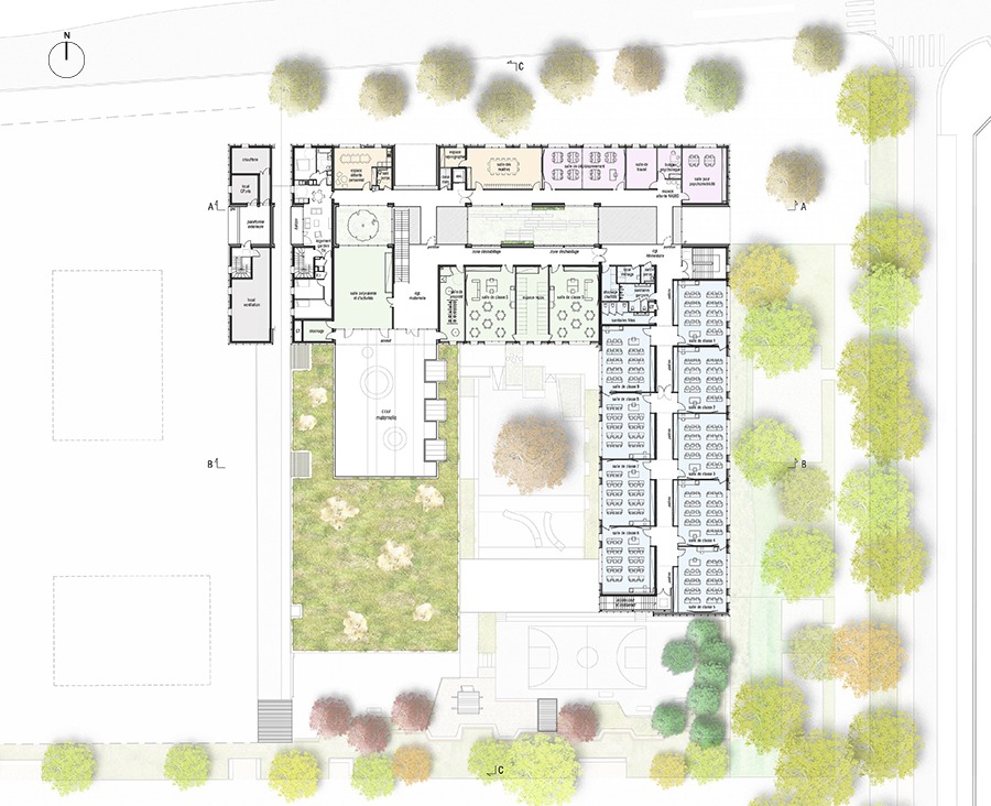 6 classes de maternelles (200 élèves) et 9 classes élémentaires (250 élèves), restauration, périscolaire et 3 salles d’activité/motricité de 80 m² environ.