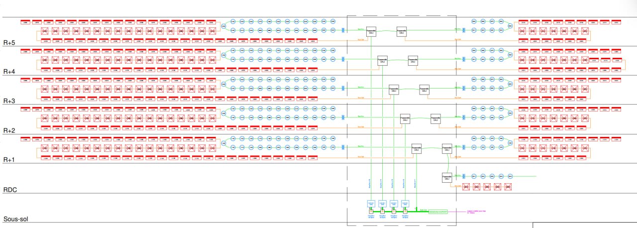 - 10 passerelles KNX/DALI réparties dans les étages pour un contrôle unifié